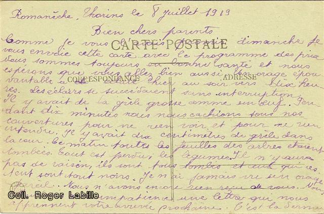 La correspondance au dos de cete carte datée du 8 juillet 1919 est très intéressante. Elle nous apprend que la veille au soir vers 22 heures un très gros orage de grêle s'est abattu sur Romaneche-Thorins causant de gros dégâts. Des grelons de la taille d'un oeuf ont tout détruit, feuilles des arbres, légumes et raisins.