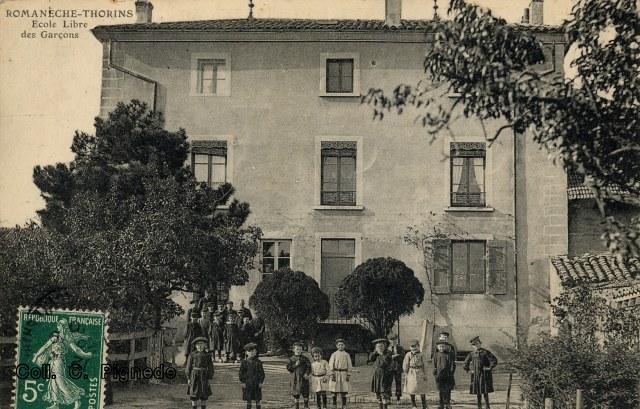 Selon une source bien informée, il a existé une autre école à Romanèche-Thorins. C'était un pensionnat de garçons. Nous ne possédons pas de carte postale de cet établissement pour la bonne raison qu'il a disparu en 1880. A cette époque la carte postale n'avait pas encore droit de cité à Romanèche. Certains seront surpris d'apprendre que cette école était située à l'angle de la rue du commerce et de la route du Moulin à Vent.