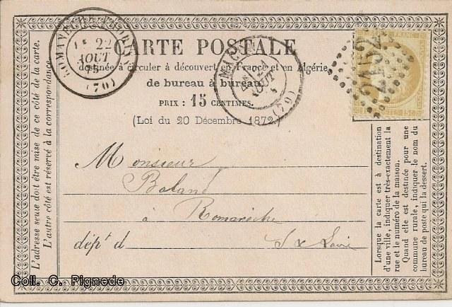 J'ai la chance de posséder une telle carte, postée à Mâcon le 21 août 1875, destinée à une personne de Romanèche-Thorins