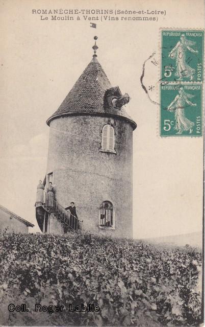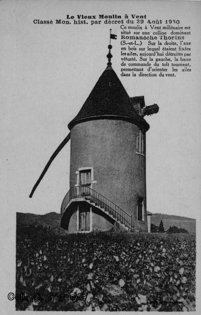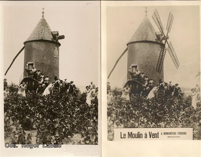 Pourtant la présence d'ailes complètes sur celle de gauche, la daterait d'après 1904. Mais il est possible que cette carte utilise un cliché plus ancien.Après tout la photographie a été inventé en Saône et Loire.Il faudrait savoir a quelle période à la fin du XIXème siècle le moulin avait des ailes complètes.