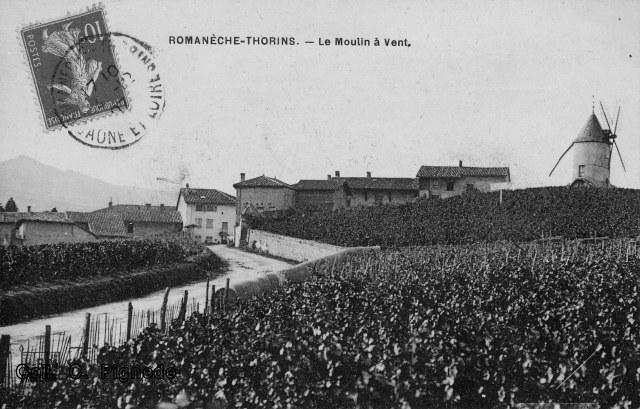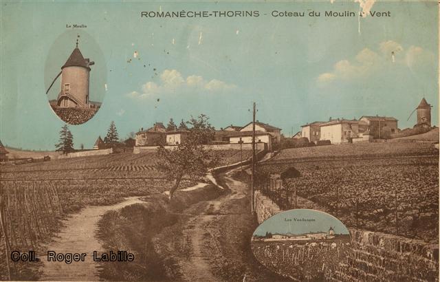 N'oublions pas que le moulin à Vent a figuré en bonne place sur de nombreuses étiquettes de viticulteur. Je m'excuse auprès de tous les viticulteurs dont je n'ai pas les étiquettes! Il a aussi constitué un excellent support publicitaire. Coté postal, Romanèche-Thorins a eu très tôt une flamme avec le moulin pour emblême. La poste a aussi édité des carnets de timbres sur le thême du moulin à vent, et de la commune.