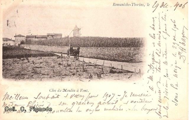 La carte du milieu " Clos du moulin à vent" a été postée en 1907. Les ailes du moulin étaient donc récentes. A cette date le Clos étaient la propriété du Dr Tagent. On peut le lire sur le panneau des quatre cartes ci dessous.