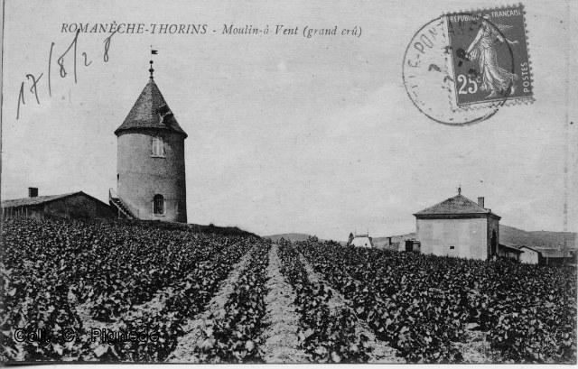 La propriété de Mr Desmarquet au Moulin à Vent a fait l'objet de très nombreux tirages et rééditions, en noir et blanc, sépia, avec ou sans marge. Ayant le monopole de la marque "Clos du moulin à Vent" Mr Desmarquet fit imprimer la carte ci dessous. Remarquer que le moulin n'a que trois ailes, car elles ont été mal dessinées.