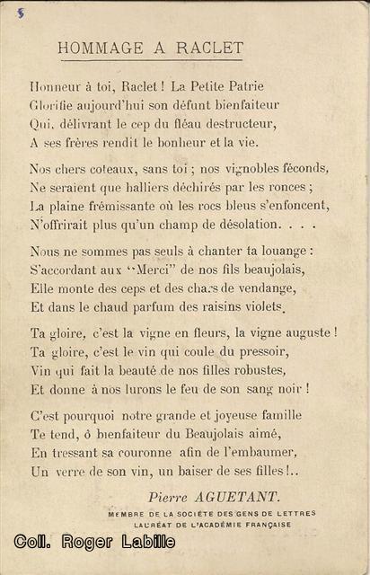 Le titre de cet ouvrage :"Un Sauveur de la Vigne Benoit RACLET , Histoire d'une grande découverte en Beaujolais et Mâconnais"