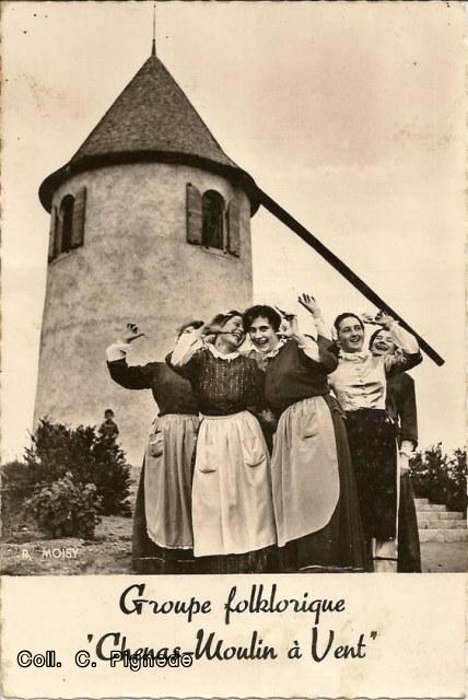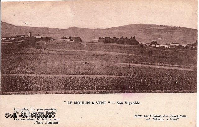 Cette carte réalisée par Benoit chuffin lors de la fête Raclet, fait apparaître la bannière de la fanfare de Romanèche-Thorins. Celle ci présente en son centre un moulin à vent entouré des sarments portants feuilles et fruits.
