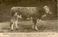 Mais aussi, plus surprenant, Romanèche n'était pas seulement une commune viticole. En 1935, le syndicat des éleveurs présenta des animaux de ferme au Concours Général Agricole à Paris. Avec le tareau Rémus de race tachetée , ils obtinrent le 1er prix......... . L'histoire ne dit pas qui était l'éleveur de ce magnifique animal.