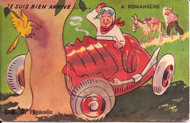 Certains partent, d'autres arrivent......... Cette dernière carte de années1950 est une carte à mécanisme. En soulevant le capot, on déplie une série de 10 minis cartes des années 1950 de Romanèche-Thorins.