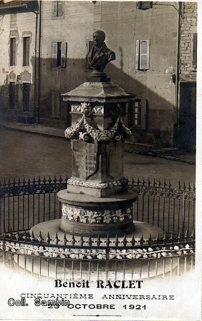 A l'opposé de l'église , dans un coin de la place a été érigé le buste de Benoit Raclet. Nous avons déjà présenté certains documents se rapportant a ce monument. Nous compléterons ici avec quelques autres clichés en notre possession.