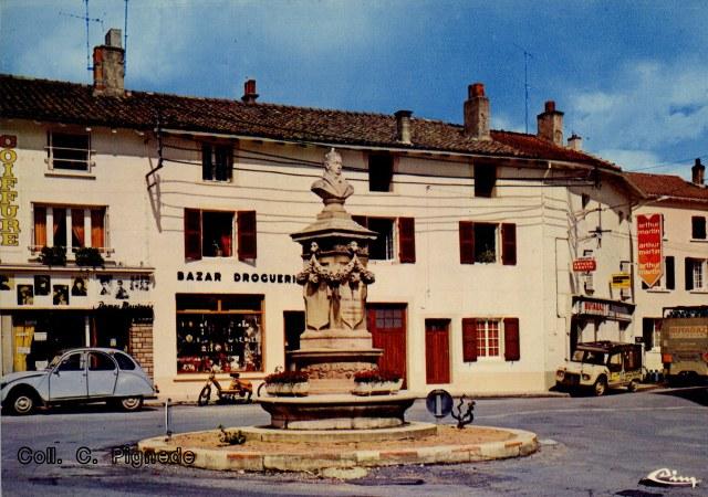Ce cliché en couleur, qui date des années 60, nous montre que les belles grilles qui entouraient le monument ont disparues. Derrière la Citroën 2CV , le salon de coiffure de Joannès Droin