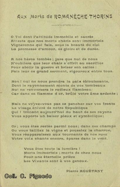 Pierre Aguétant écrivain et poète écrivit ce poème pour le jour de l'inauguration du monument. Il a été imprimé au dos d'une série de cartes postales