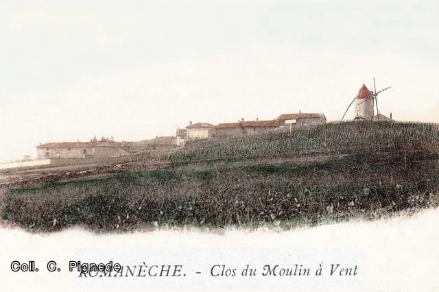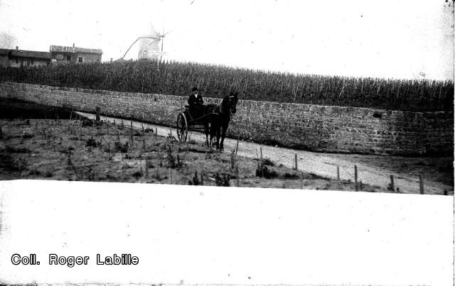 La carte du milieu " Clos du moulin à vent" a été postée en 1907. Les ailes du moulin étaient donc récentes. A cette date le Clos étaient la propriété du Dr Tagent. On peut le lire sur le panneau des quatre cartes ci dessous.