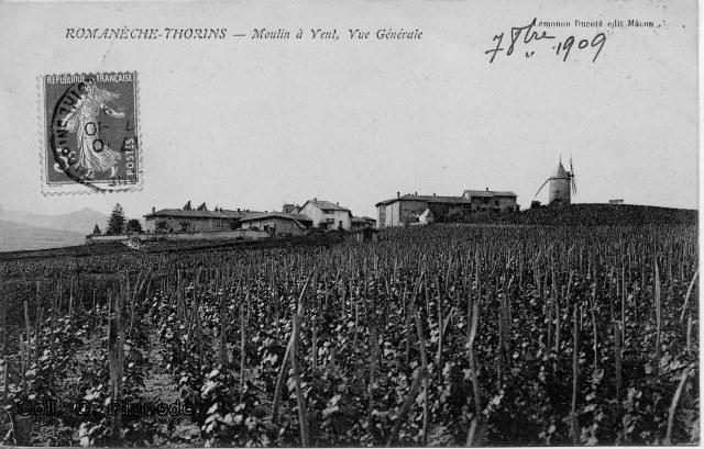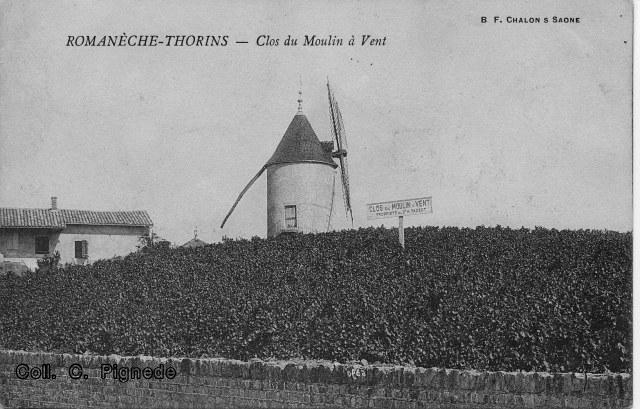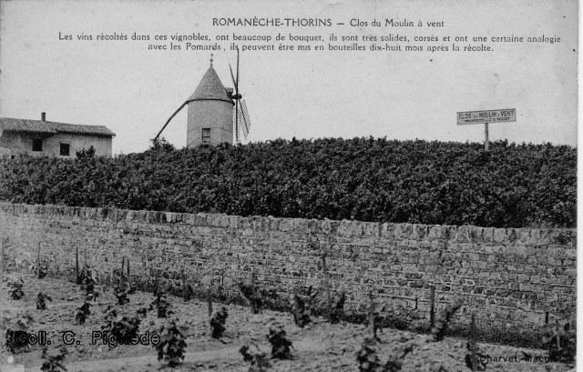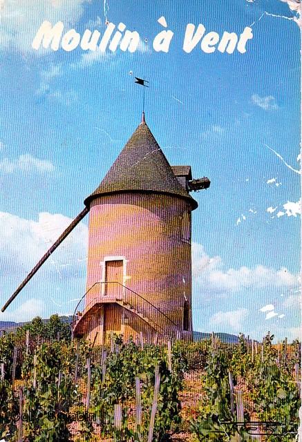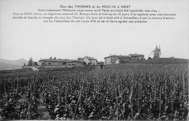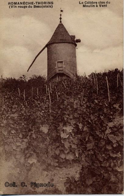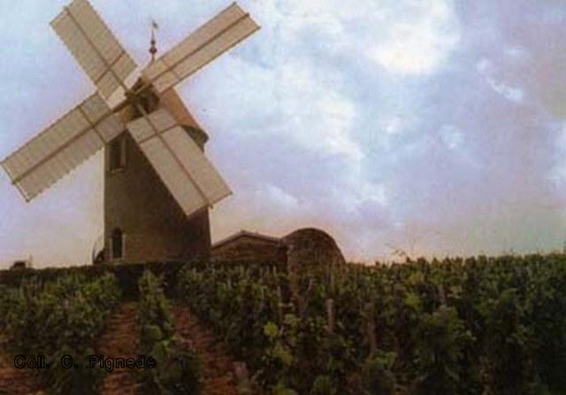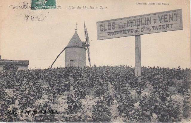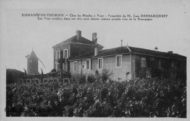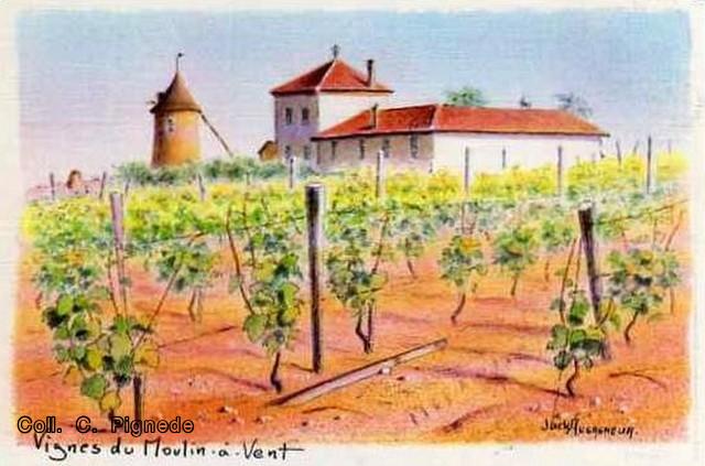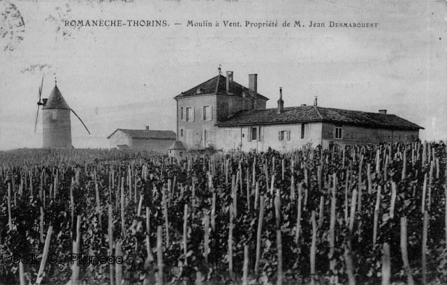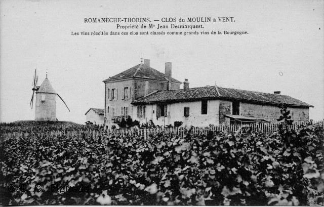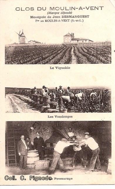 La propriété de Mr Desmarquet au Moulin à Vent a fait l'objet de très nombreux tirages et rééditions, en noir et blanc, sépia, avec ou sans marge. Ayant le monopole de la marque "Clos du moulin à Vent" Mr Desmarquet fit imprimer la carte ci dessous. Remarquer que le moulin n'a que trois ailes, car elles ont été mal dessinées.