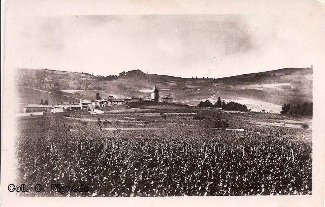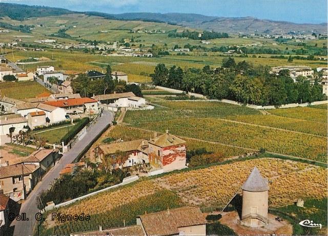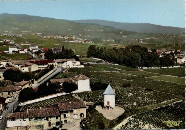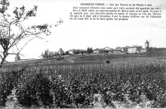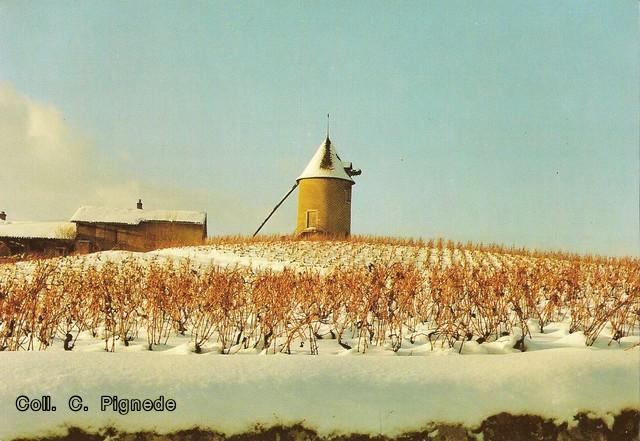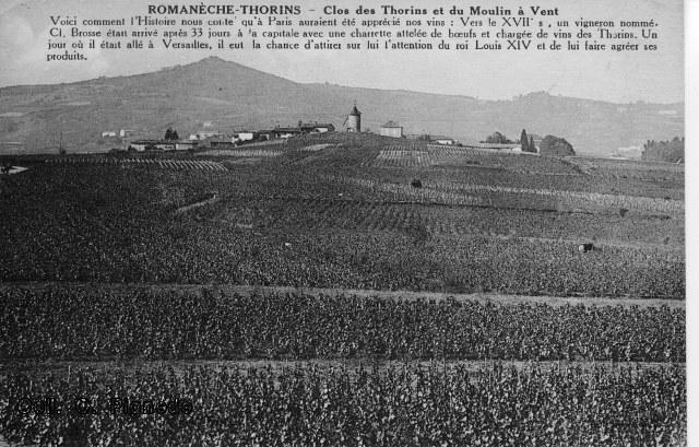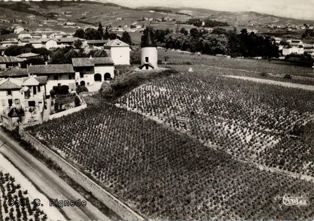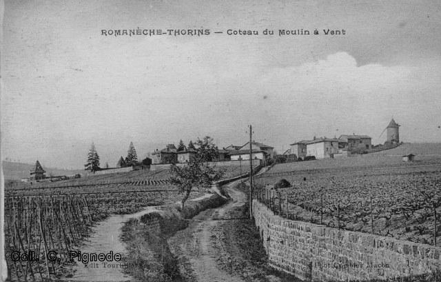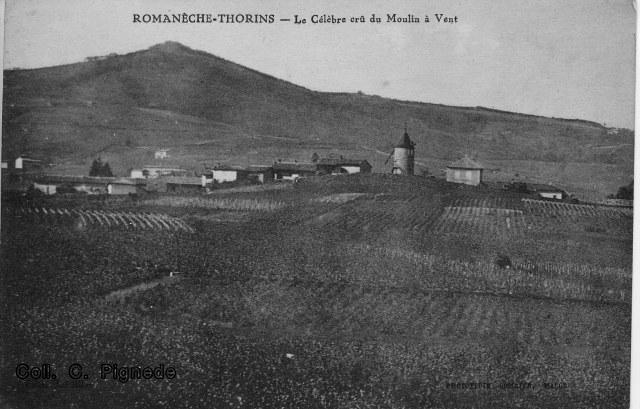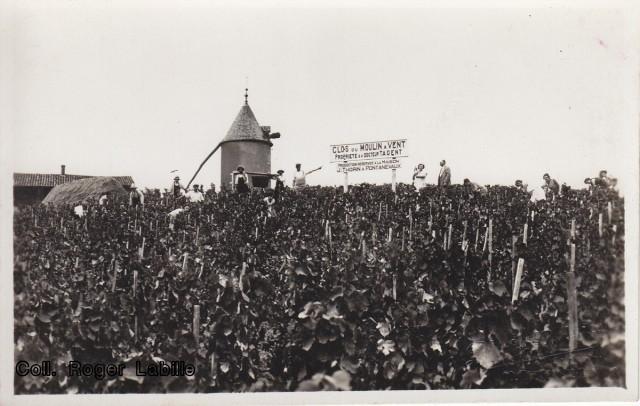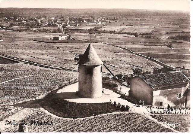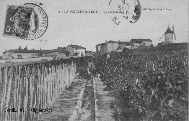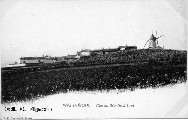 La propriété de Mr Desmarquet au Moulin à Vent a fait l'objet de très nombreux tirages et rééditions, en noir et blanc, sépia, avec ou sans marge. Ayant le monopole de la marque "Clos du moulin à Vent" Mr Desmarquet fit imprimer la carte ci dessous. Remarquer que le moulin n'a que trois ailes, car elles ont été mal dessinées.