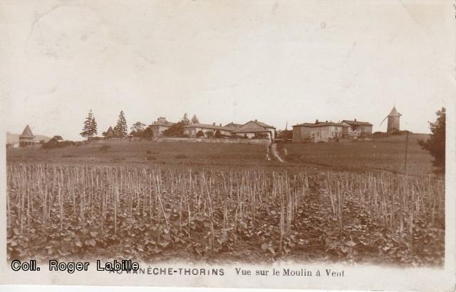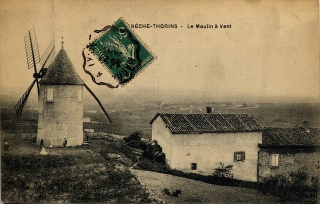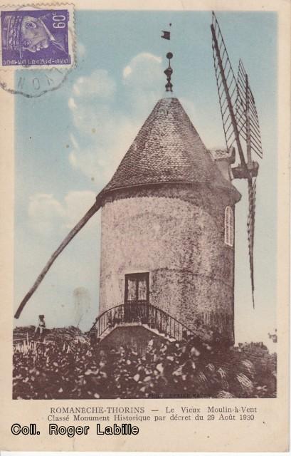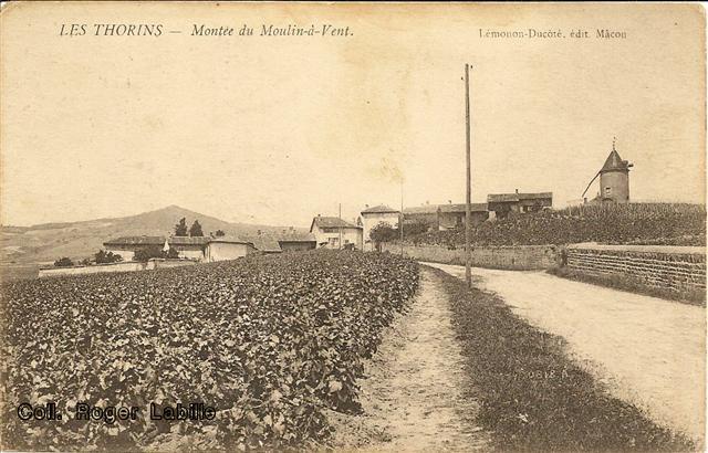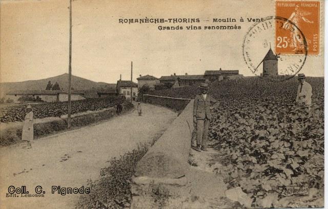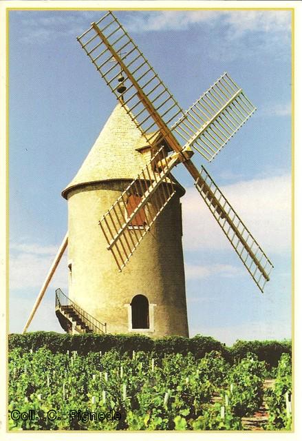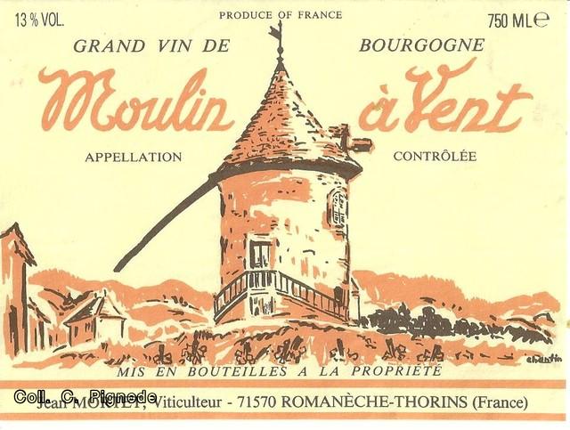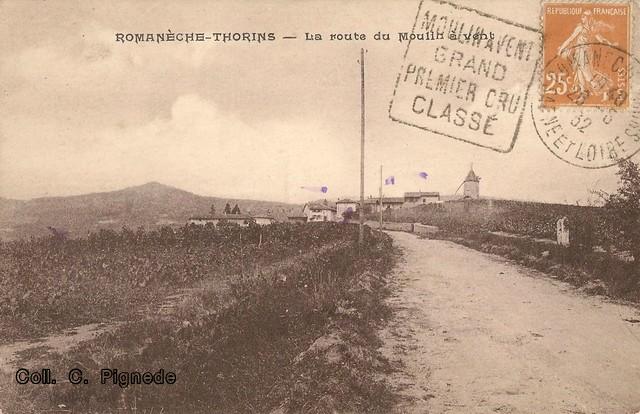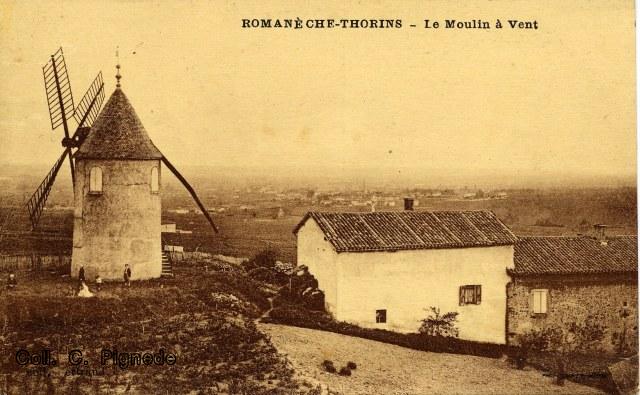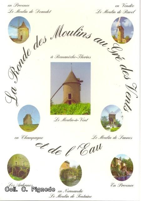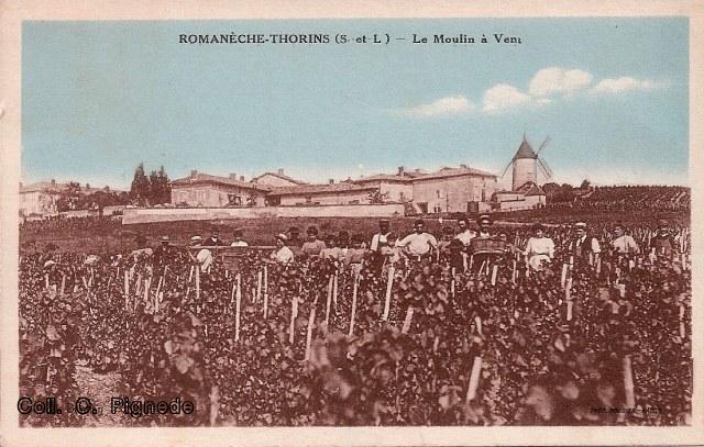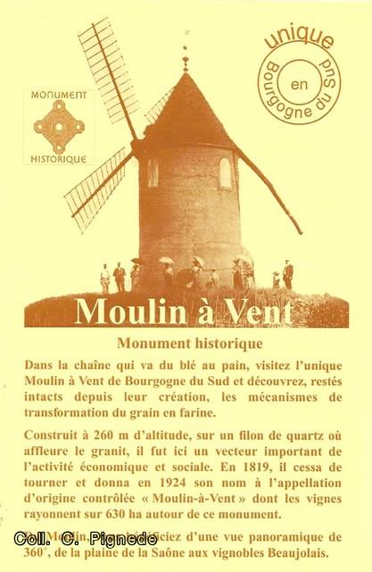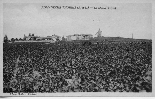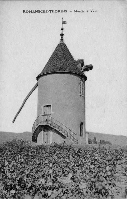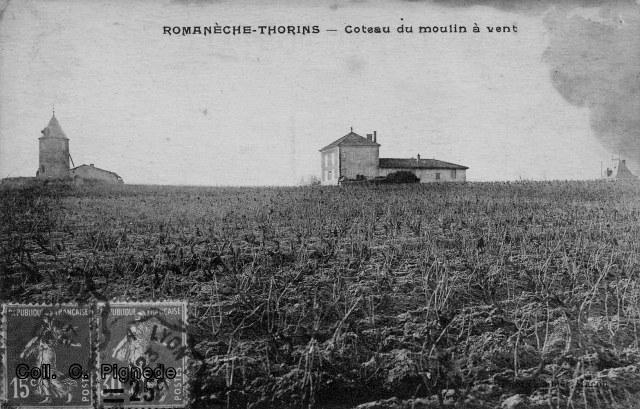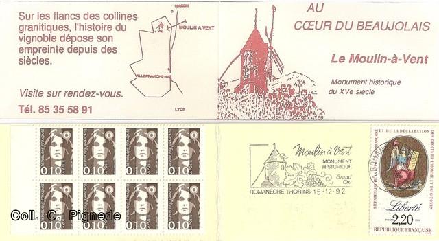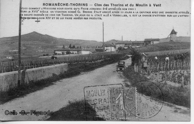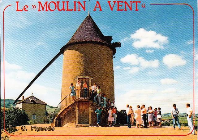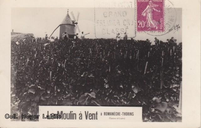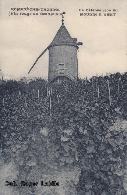 N'oublions pas que le moulin à Vent a figuré en bonne place sur de nombreuses étiquettes de viticulteur. Je m'excuse auprès de tous les viticulteurs dont je n'ai pas les étiquettes! Il a aussi constitué un excellent support publicitaire. Coté postal, Romanèche-Thorins a eu très tôt une flamme avec le moulin pour emblême. La poste a aussi édité des carnets de timbres sur le thême du moulin à vent, et de la commune.