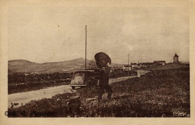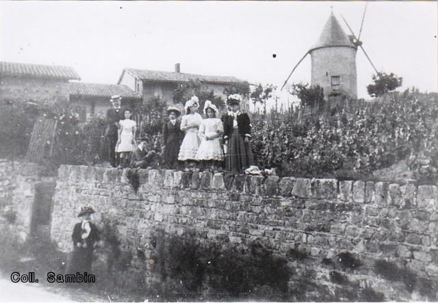 La montée du Moulin à Vent. Une des plus belles photos, réalisée en 1907/1908, de Benoit Chuffin éditée en carte postale. Le moulin avec ses ailes, un attelage de vaches, on distingue le pis et les tétines, les hommes avec leur canotier et leur tablier, une dame du monde en grande tenue, un vélo d'époque, en arrière plan d'autres personnages en tenue de "tous les jours" , et même une meule appuyée contre le mur.