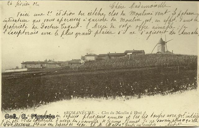 Remarque , les dos de ces cartes est réservé à l'adresse du destinataire, donc elles ont été imprimées au plus tard en 1903. Celle de droite a été postée le 24 février 1902. L'expéditrice nous précise qu'il sagit d'une deuxième édition de la carte du célèbre clos du Moulin à Vent propriété du Dr Tagent. La première édition a donc été imprimé en 1901 ou avant.