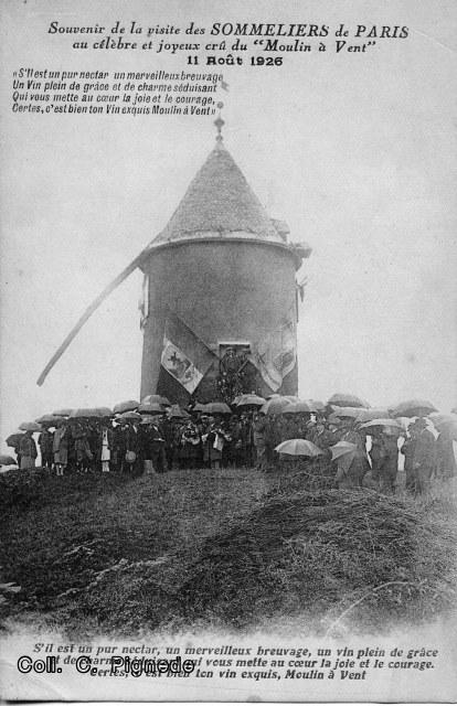 Mais les ailes ne sont pas éternelles et le 11 août 1926, lors de la visite des sommeliers de Paris le Moulin avait perdu ses ailes. Remplacées en 1904 elles n'ont donc résisté au temps. Nous avons la preuve qu'en 1912, elles étaient déjà tombées. A noter que ce jour là, en guise de pur nectar et de merveilleux breuvage, les sommeliers ont vécu une journée bien arrosée. Les parapluies étaient de sortie.