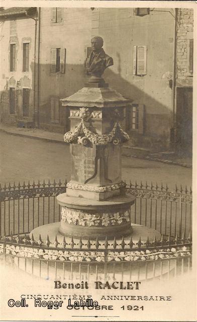 A l'origine le statue de Benoit RACLET fut érigée à l'entrée du bourg, au dessus des galeries de mines qui furent exploitées par la compagnie minière dont Benoit RACLET fut un des actionnaires. Un tassement du sol provoqua la chute du monument. Le 11 septembre 1881, il fut alors transféré à son emplacement actuel, face à l'église, où il prit la place d'une croix en pierre qui fut réinstallée au cimetière.