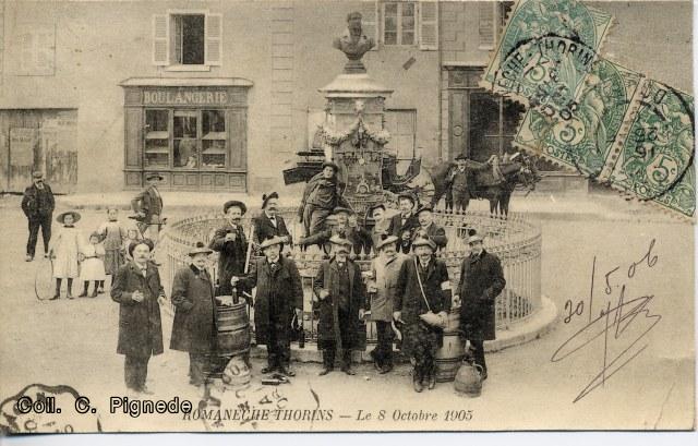 Qui sont ces joyeux lurons qui se sont retrouvés à Romanèche-Thorins le 8 Octobre 1905. Ils semblent appartenir à une confrérie vini-viticole. sur l'étendard accroché au buste de Raclet on parvient à lire LA...... Cigogne Lyon 1904. Ils sont tous coiffés d'une " Faluche " couvre chef traditionnel des étudiants de France !!!